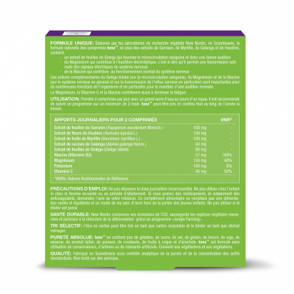 Les comprimés 100% naturels Tone contiennent une combinaison unique d’extraits végétaux et de nutriments qui participent au bon fonctionnement du système auditif.